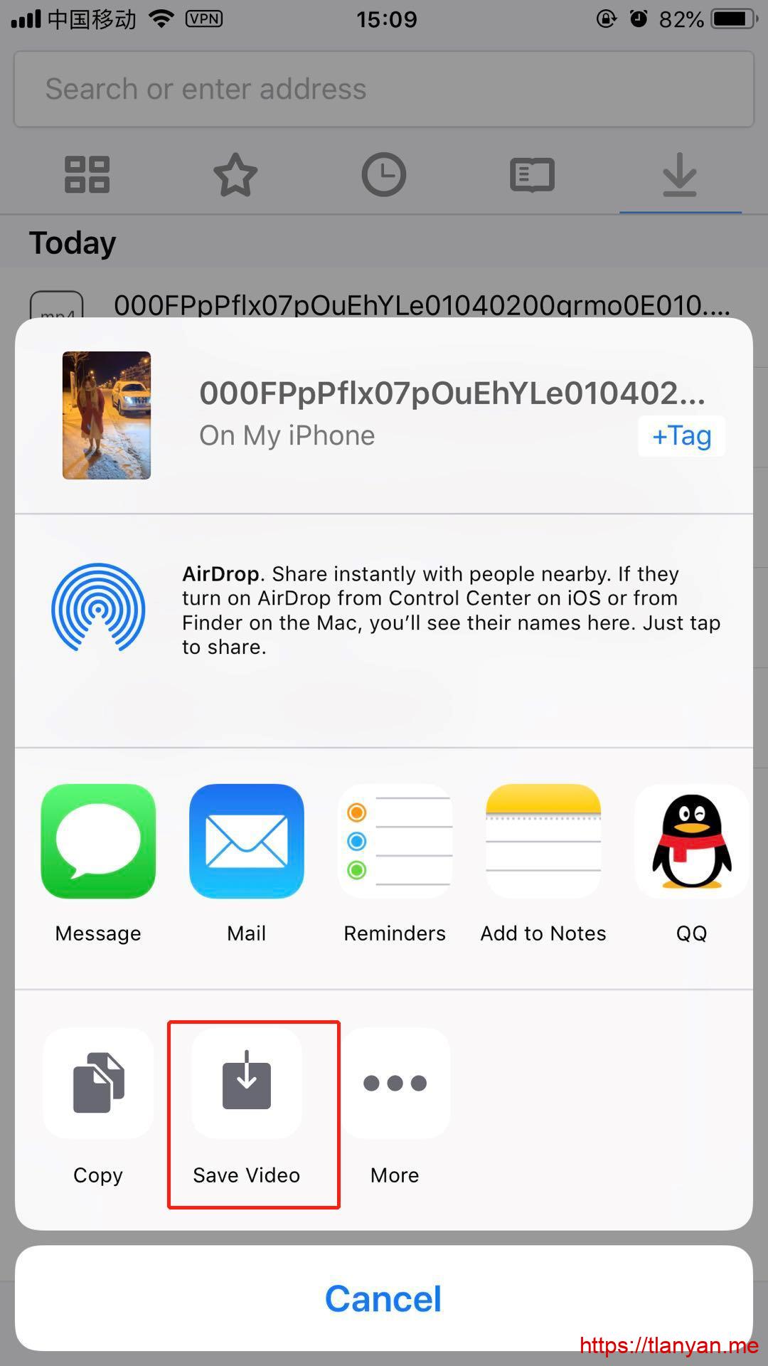 - 由于iOS系统的尿性,视频不会出现在照片或者图库里。接着打开Firefox的“下载”页面,点击下载的视频,选择“保存视频”: