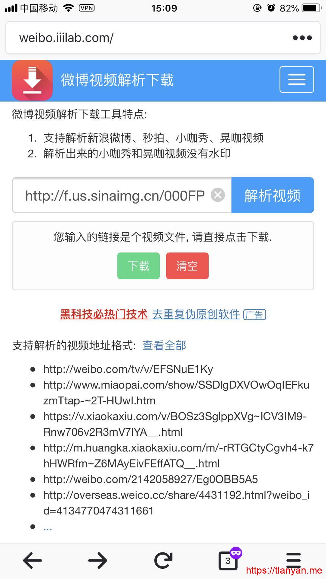 - 解析视频的真实地址:解析twitter视频我用的 https://twittervideodownloader.com,微博用 http://weibo.iiilab.com,当然也可以使用其他能解析视频的网站。用Firefox浏览器打开解析视频地址页面,张贴复制的地址到输入框,点击解析,接着会看到页面上出现了“下载”按钮:
