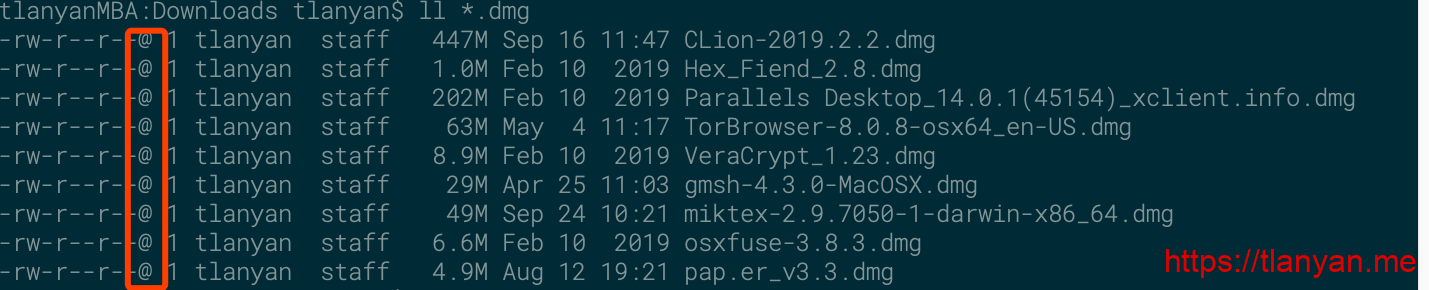 macos系统的ls -l(或者ll)命令输出第一列会出现@符号,而linux系统则不会。平时稍微留意了一下,带有@符号的多是从互联网上下载的文件,因此猜测可能是安全属性标志。
