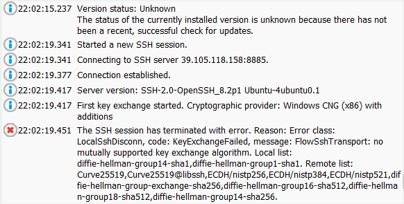根据其提供的信息,问题的关键在于这句话:”no mutually supported key exchange algorithm“。即最新版Ubuntu用了更安全的密钥交换算法,而Bitvise不支持这些算法,因此无法完成连接。