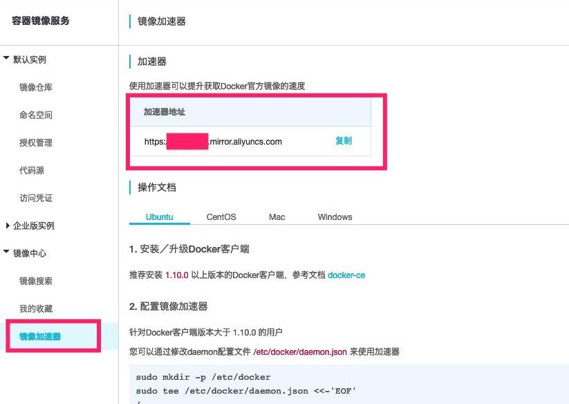 阿里云docker镜像加速地址获取方法:登录容器镜像服务控制台,在左侧导航栏选择镜像工具 > 镜像加速器,就可以看到独立分配的加速器地址(期间会让你设置Registry密码,不用管,直接关掉就行了):