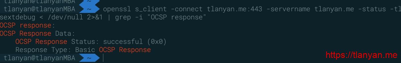 openssl s_client -connect 域名:端口 -servername 域名 -status -tlsextdebug < /dev/null 2>&1 | grep -i "OCSP response",已开启的输出如上,未开启则输出“OCSP response: no response sent”