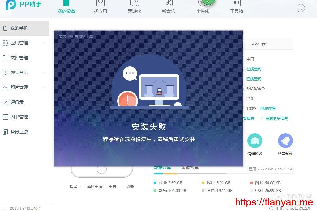 今天打开ipad,pp助手越狱版点击闪退,其他已安装软件也闪退。按照之前的做法,连接到电脑上,重新越狱一次即可。估计今天pp助手抽风,越狱时总是提示:“安装失败 程序猿在玩命修复中,请稍后安装”。重试了许多次依然如此,更新、重装皮皮助手也无济于事。