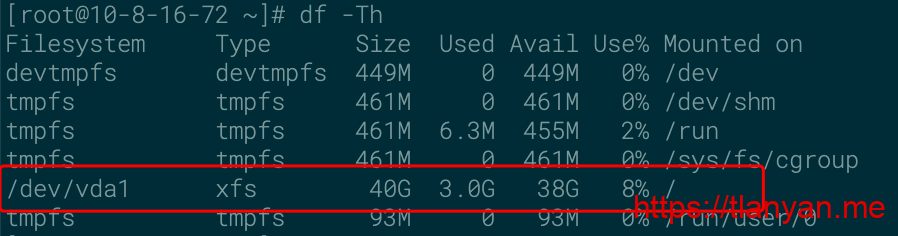 df -Th: 查看系统的磁盘使用情况及文件系统。扩容前是20G,扩容成功后应该出现40G,文件系统是xfs: