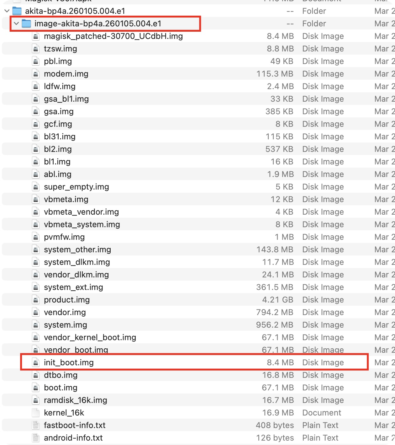 此时Magisk还是一个普通的app,要获得root能力需要加载到内核中。我们先从谷歌官网下载手机的原版系统镜像:https://developers.google.com/android/images?hl=zh-cn,搜索手机型号,比如pixel 8a,找到上文提到的Build号(比如我的Pixel 8a是 BP4A.260105.004.E1,一定要完全一致!),点击“链接”或者”Link”下载(不要点“闪光灯”或“flash”)下载镜像文件(大概3~4GB)。下载后解压镜像zip文件,然后再解压以image-xxx开头的zip文件(文件体积最大的那个),在解压的文件夹中找到init_boot.img文件。