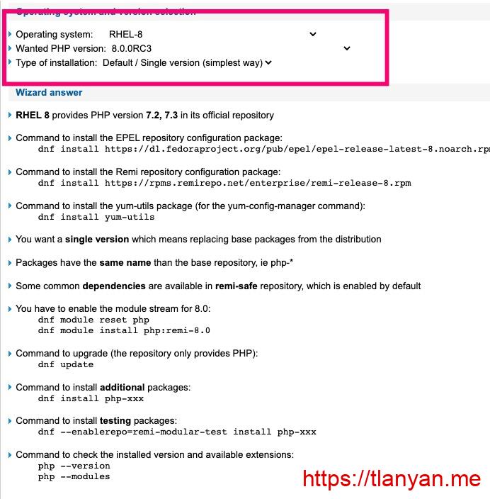 上面的安装命令复杂难记?没关系,Remi源贴心的提供了安装向导。在向导页面中输入你的操作系统版本,要安装的PHP版本和安装方式,安装教程就出来了(本节对应default/single version安装方式):