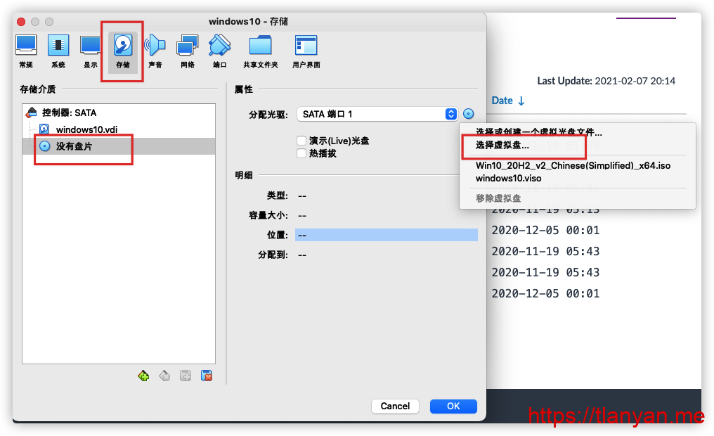 下载好系统文件后,在VirtualBox左侧选择刚才创建的系统,然后点击上方菜单的“设置”,接着点击“存储” => 左侧的光盘按钮,然后点右侧按钮下拉菜单中的“选择虚拟盘”,然后选择下载的系统文件,最后点击“OK”: