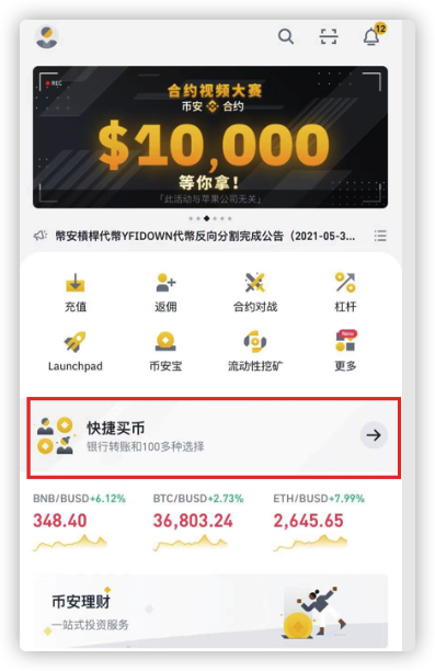 打开币安App,首页就可以看到用人民币购买虚拟货币的入口: