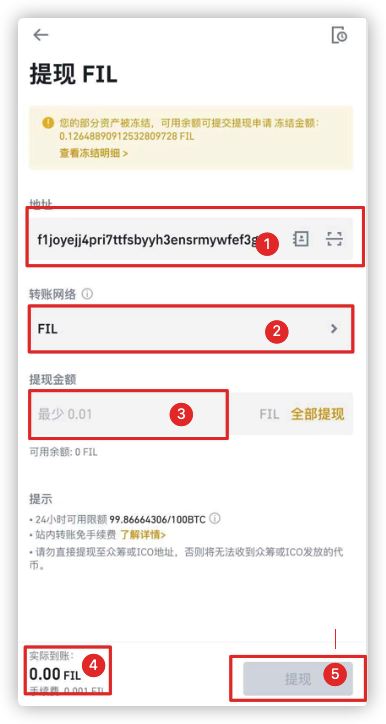 2. 从币安或火币提币到算力云储:打开币安或火币App,点击右下角的“资金”(或者“资产”),点击“提现”(或者“提币”),币种选择FIL,在地址栏张贴刚才复制的充币地址,转账网络选择“FIL”,输入提现数量,最后点击“提现”: