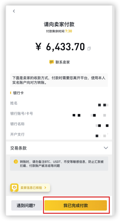 卖家确认收到付款后会很快发放USDT到您的账户,如果遇到问题请点击“遇到问题”联系客服。