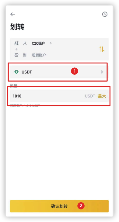 然后币种选择“USDT”,输入数量,点击下方的“确认划转”: