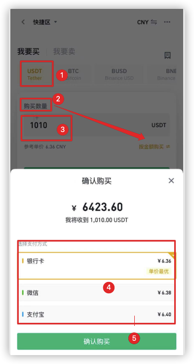 身份认证完成后,点击首页的“快捷买币”入口,接下来就可以买USDT了。首先选择购买USDT币,然后点击金额下方的“按数量购买”,输入购买的USDT数量,选择支付方式,操作步骤见下图: