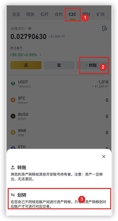 币安购买的币在C2C账户里,需要转到现货账户才能交易和提币。划转操作为:点击App右下角的“资金” -》点击“C2C” -》点击“转账” -》选择“划转”,操作流程见下图: