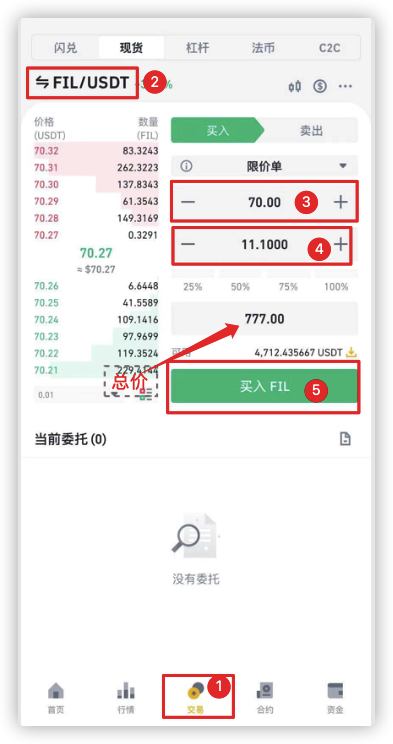 划转成功后,接下来就可以购买FIL币了。操作步骤是:点击下方的“交易”图标,选择“FIL/USDT”交易对,输入购买价格和数量,点击“买入FIL”委托下单: