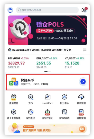 火币购买USDT后直接发放到币币账户,无需上述划转操作