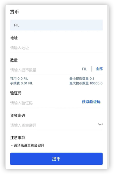 FIL提现到交易账户后,可以申请提现到其他地址,即可提现到交易所卖掉。在提现之前,请在个人设置中完成账户实名认证,并设置资金密码。提现的操作步骤为:
