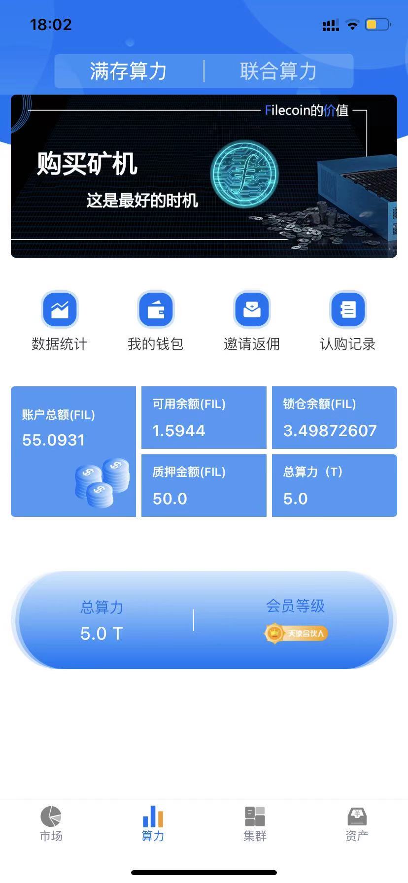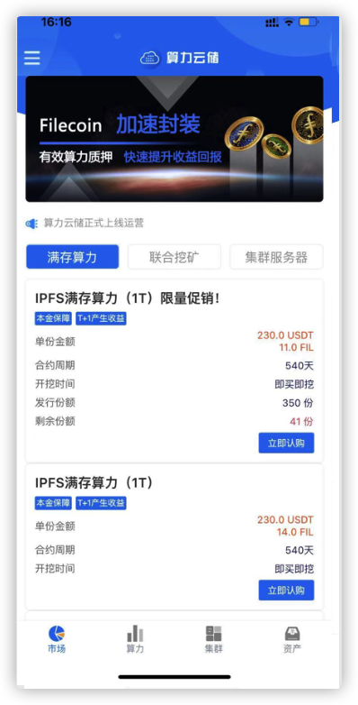这里推荐在算力云储App上购买FIL算力,算力云储是广州算力云科技有限公司开发的产品,本人深度参与了项目的整个流程,使用过程中遇到问题可随时联系本人。