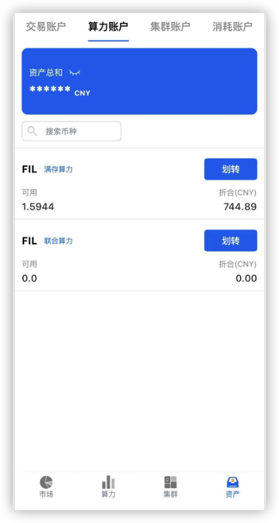 云算力产出的FIL可在App右下角的“资产” -》 “算力账户” 中查看,点击“划转”按钮可将其划转到交易账户: