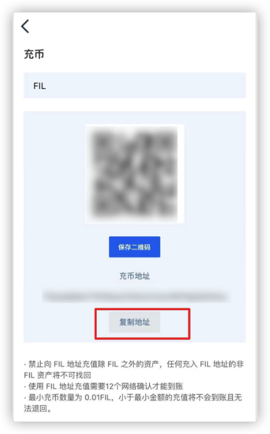 1. 获取算力云储的FIL充币地址:打开“算力云储”App,点击右下角的“资产”图标 -》点击“FIL” -》点击“充币” -》点击“复制地址”: