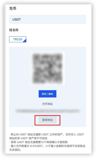 1. 首先获取算力云储的USDT充币地址:打开“算力云储”App,点击右下角的“资产”图标 -》点击“USDT” -》点击“充币” -》点击“复制地址”: