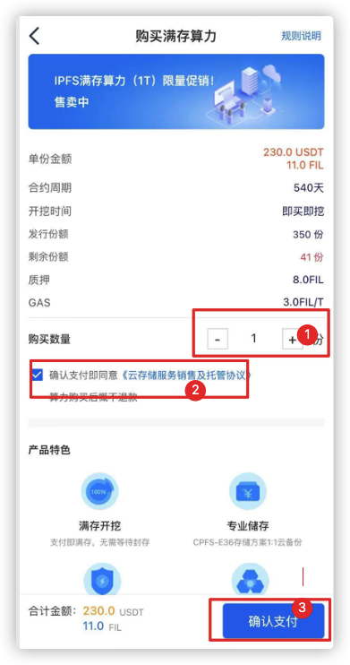 打开算力云储App,首页便能看到正在销售的产品。点击要购买的产品,输入数量,勾选同意协议的框,点击“确认支付”便完成了购买: