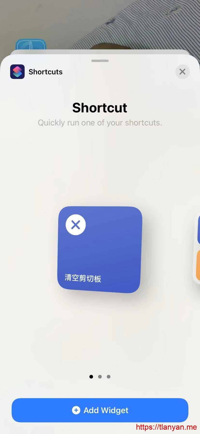 回到桌面,在空白处长按,点击左上角的“+”,往下翻找到“快捷指令”(Shortcuts),选择清空剪切板,点击“添加组件”: