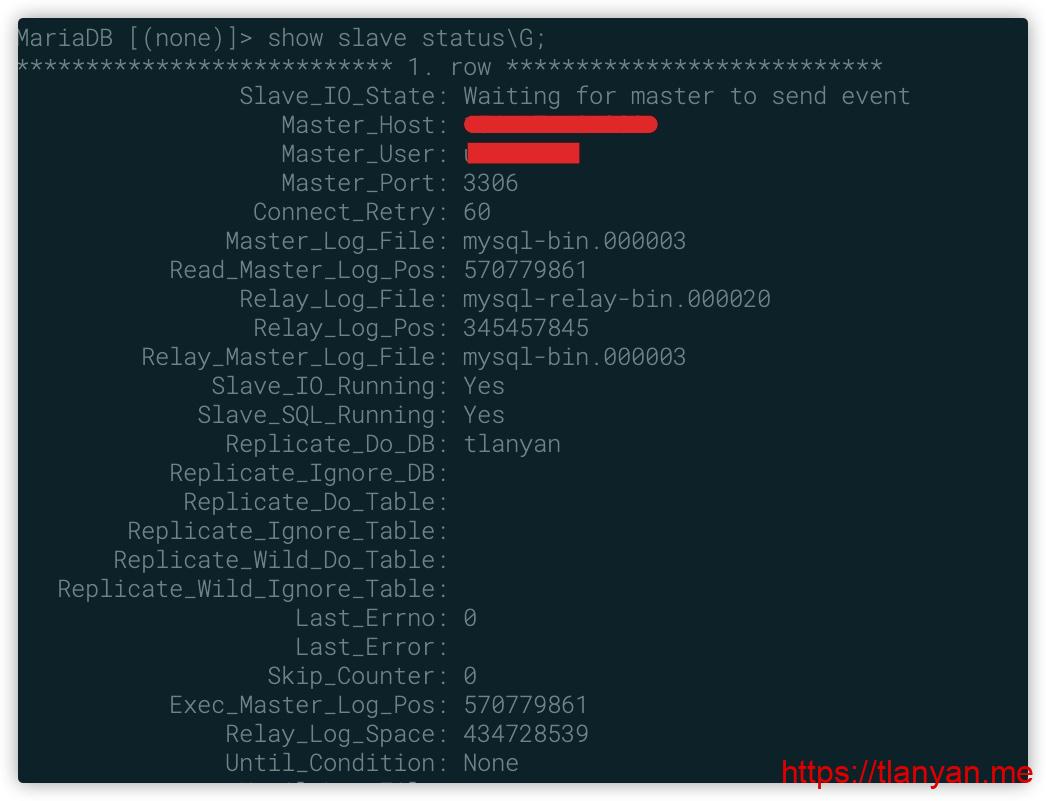 启动复制进程不报错的话,说明已经正确配置成功了。通过show slave status\G; 命令能看到日志读取IO线程正常工作,其他信息均正常。