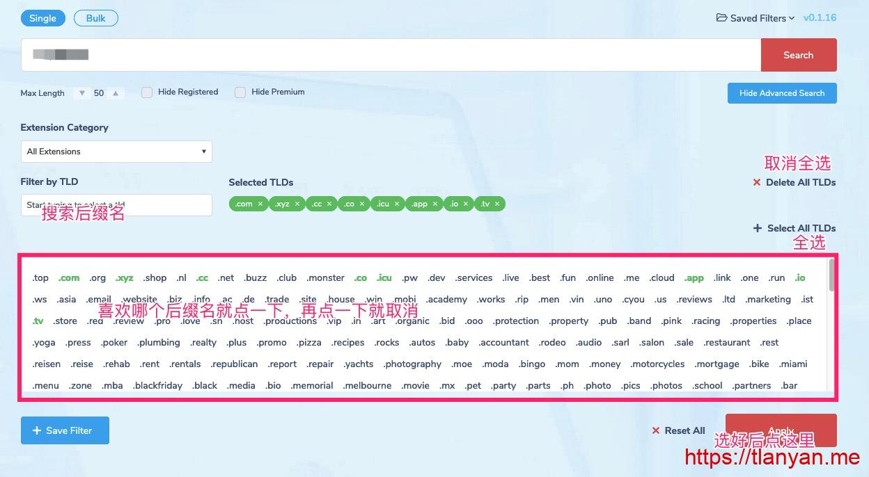 2. 接着界面会跳转到后缀选择界面。可以选择自己喜欢的后缀,例如.com、.net、.icu等,选好后点击红色的“Apply”按钮: