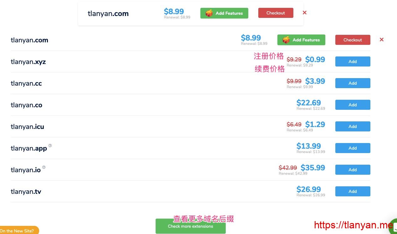 1. 有些域名后缀首年便宜但是续费巨贵,例如.pw、.xyz,长期用建议仔细看续费价格(renewal旁边的数字);