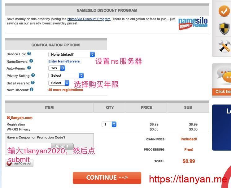 4. 点击域名右侧红色的“Checkout”按钮进入结账界面,设置域名续费规则、注册时长等。在 “Have a Coupon……” 处输入Namesilo优惠码 tlanyan2020 ,点击 “Submit” 应用,订单金额大于1美元的情况下能优惠一美元(每个用户限使用一次):