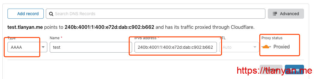 cloudflare设置ipv6解析 注意ipv6的记录是AAAA,proxy status必须选“Proxied”,即要有那朵黄云;