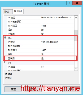 - 右键右侧的 TCP/IP 的属性,启用供外部连接的那个 IP 地址和端口。