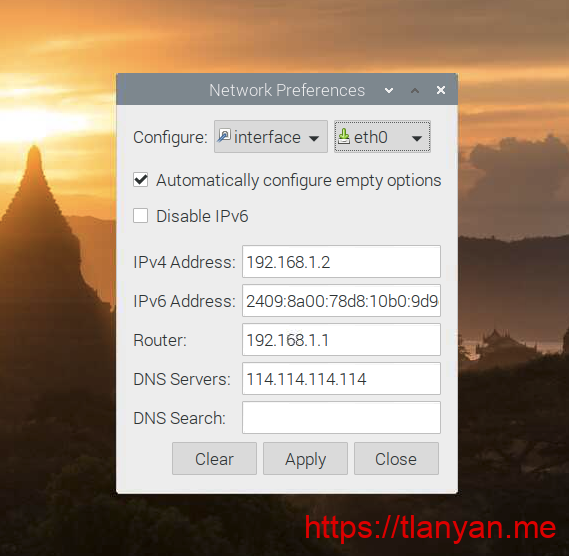 interface eth0 inform 192.168.1.2 static routers=192.168.1.1 static domain_name_servers=114.114.114.114 static ip6_address=2409:8a00:78d8:10b0:9d9e:1193:c495:228f