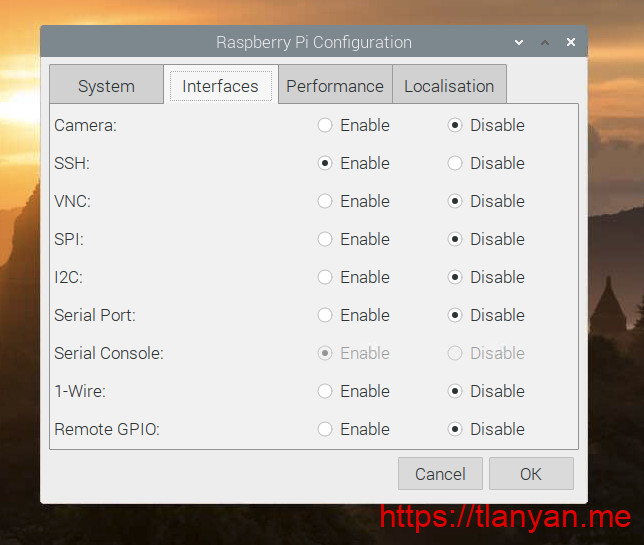 raspi-config命令,在“intefacing options”中选择“ssh”,设置为开启; - 在图形桌面中,点击左上角树莓派logo,菜单中选择“preferences” -> “raspberry pi configuration”,在弹出的窗口中选择“interfaces” -> “ssh”,点击确定。