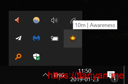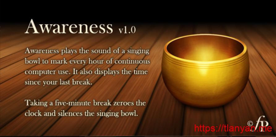 Awareness启动后会播放敲钵的声音,并在右下角托盘生成图标。此时软件已经开始计时,你可以放心地关掉桌面上Awareness的窗口,准备接下来忙碌的工作。连续用电脑达到一小时,软件将再次播放敲钵的声音,提醒你已经连续工作一小时。如果你花五分钟时间离开电脑放松放松,比如伸个懒腰顺便喝下午茶,Awareness的计时将重置为0,直到你再次用电脑才开始重新计时。用电脑期间,你可以随时将鼠标放到托盘的图标上方,看看已经连续工作了多久。