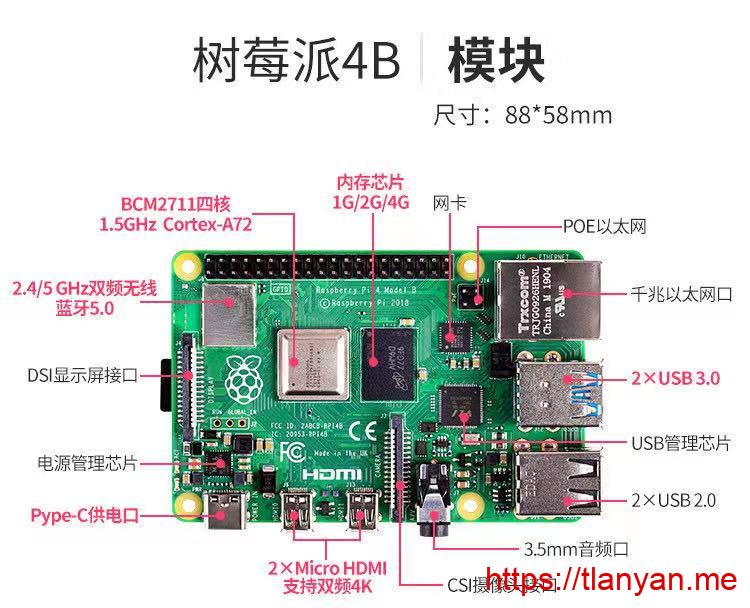 因为要安装散热片,首先了解一下树莓派4B主板的布局图(图来自淘宝卖家):
