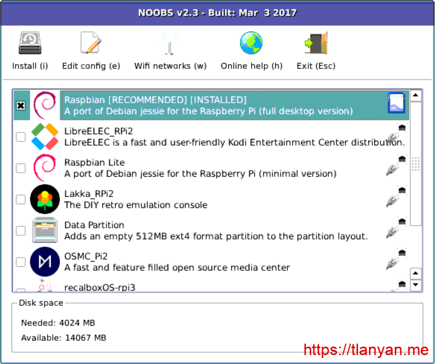 - 在弹出来的界面中选择系统和要安装的软件。如果你下的离线版,直接勾选第一个”Raspbian[RECOMMANDDED]”;如果你是老手,可以选轻量级无图形界面的raspbian lite: