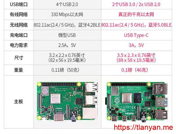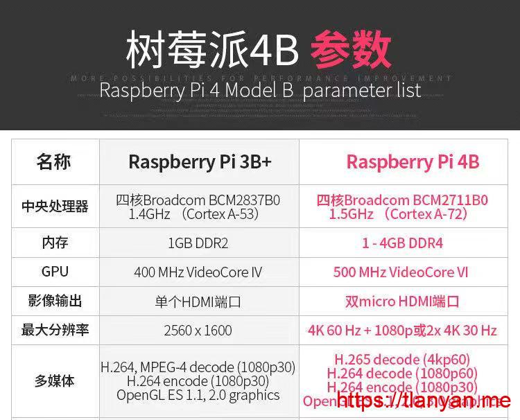 树莓派(Raspberry Pi)由英国树莓派基金会开发,其初始目的是以低廉的价格和开源软件促进学校的计算机编程教育。树莓派官方推荐操作系统是基于debian的raspbian,也能安装ubuntu,fedora,windows lot等系统。硬件上使用博通(broadcom,牛逼得要收购高通的那家公司)的ARM芯片,内存定制版,焊接在主板上。截止到目前树莓派发布过9款机型,最新版是4B,拥有4核cpu以及最高4G内存,支持usb 3.0和蓝牙5.0。以下是树莓派3B+和4B的硬件配置对比(图来自淘宝卖家):