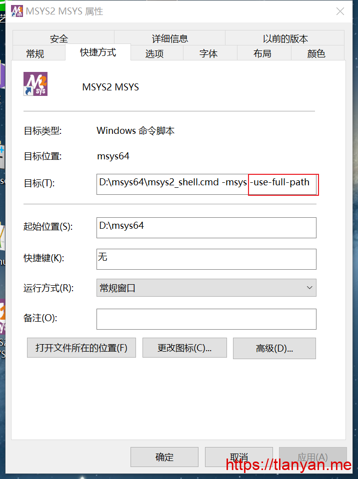 - 通过”MSYS2 MSYS”入口启动MSYS2,在快捷方式中添加”–use-full-path”参数。配置截图如下:
