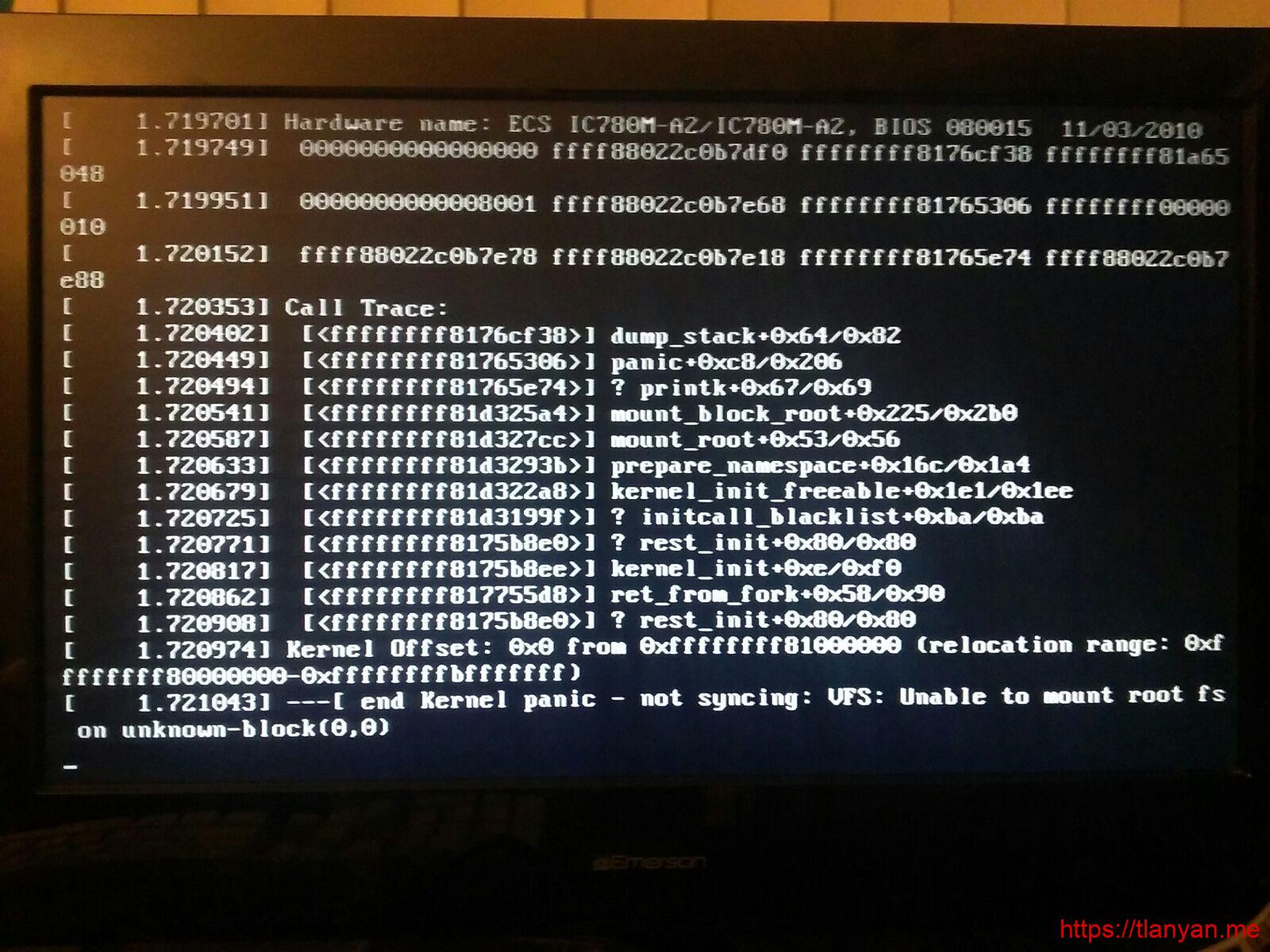 无奈之下直接断电重启,遗憾的是未能启动成功,出现“Kernel panic – not syncing: VFS: Unable to mount root fs on unknown-block(0,0)”的错误提示。从错误可以看到,内核挂载硬盘出现了问题。