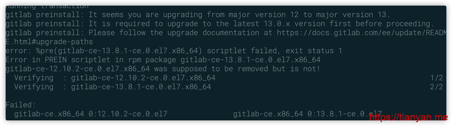 从错误原因可以看到,不能直接从Gitlab 12升级到最新版的Gitlab 13。