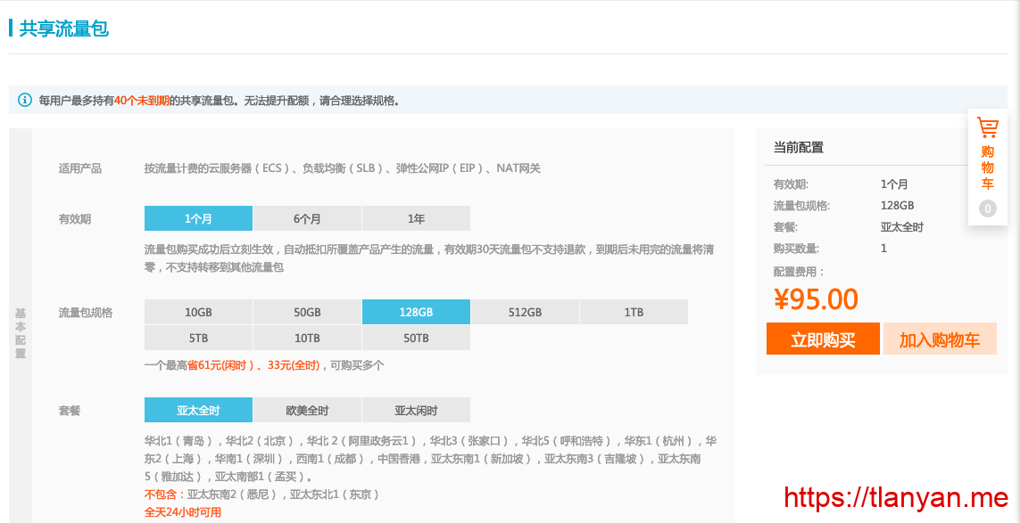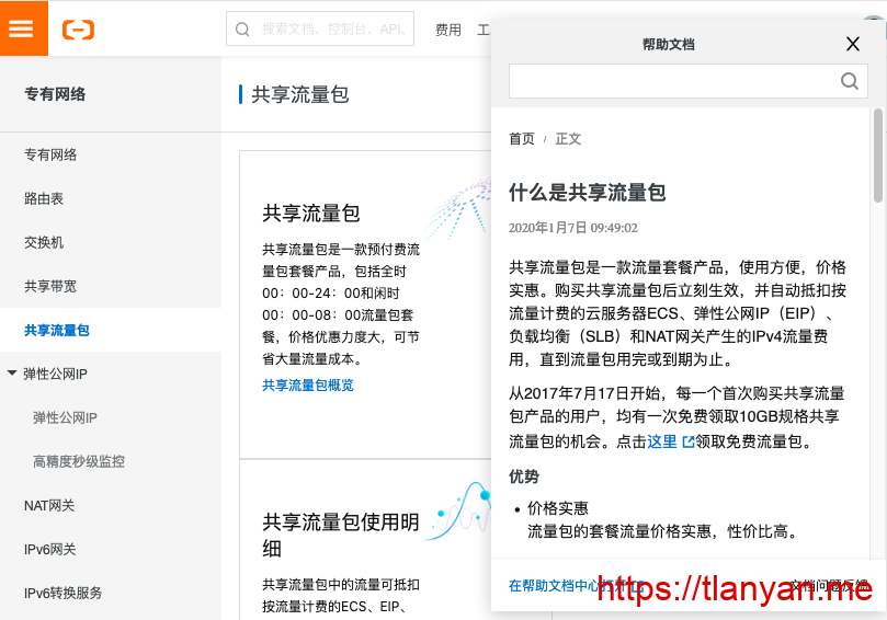 昨天进入阿里云控制管理台,无意间发现了“共享流量包”这个东西(在左侧菜单->专有网络VPC菜单页面下)。根据阿里云说法,共享流量包是一款预付费流量套餐产品,会自动抵扣按流量计费的云服务器ECS、弹性公网IP(EIP)、负载均衡(SLB)和NAT网关产生的IPv4流量费用。其中能够使用的亚太区域包含了大陆和香港,不再单独区分大陆和港澳台。