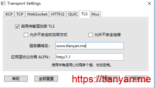 接着点击“tls”,勾选“启用传输层加密tls”(同时建议勾选“允许不安全的加密方式”和“允许不安全连接”),在“服务器域名”的输入框中输入域名,截图如下: