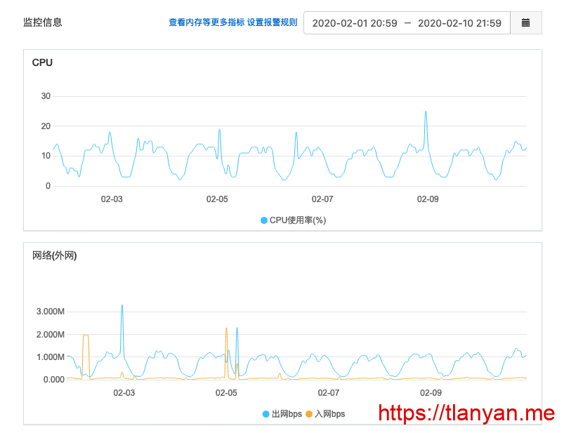 用了这么久的WordPress,对WordPress的性能优化也有了不少的经验。目前本站峰值PV 3万,峰值IP 1.6万,alexa排名大概15-18万之间,运行在阿里云1核2G 峰值100m带宽的t5突发性能实例上,平均cpu使用率在10%以下,内存占用基本不超过1G,非常平稳: