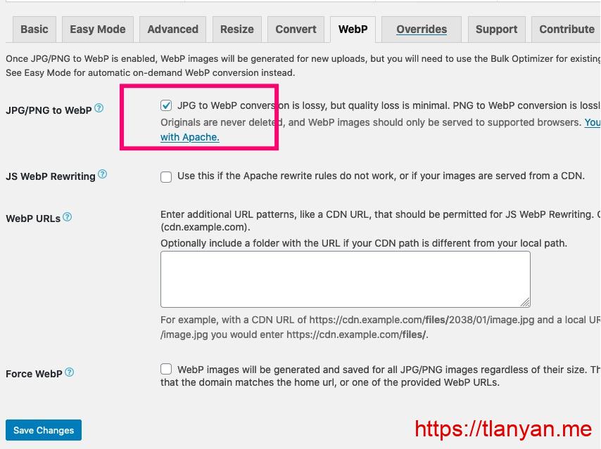 首先我们设置EWWW Image Optimizer自动转换webP格式:WordPress后台“设置”-》“EWWW Image Optimizer”->”WebP”,勾选“JPG/PNG to WebP”,然后点击下面的”Save Changes”按钮保存。