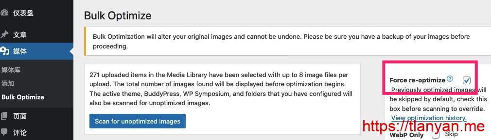 1. WordPress后台“媒体”->”Bulk Optimization”,打开EWWW Image Optimizer优化页面;