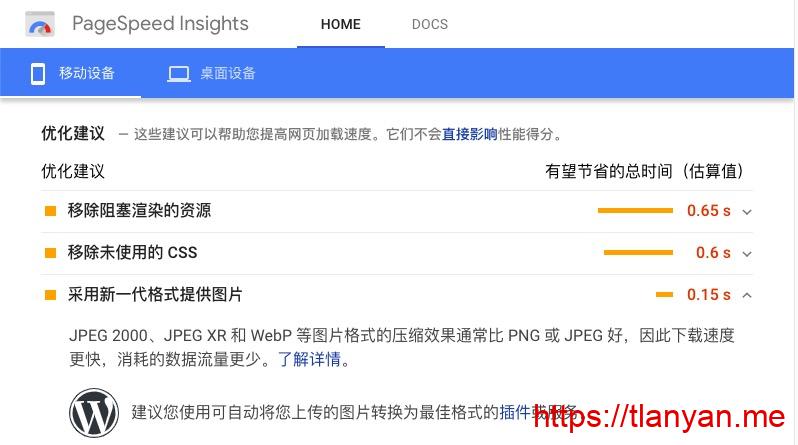 webP是新一代的图片格式,在保证肉眼识别无差异的图像质量基础上,采用更优秀的压缩算法减少图片体积,从而加快图片网络传输速度。如果你使用过 PageSpeed Insights,应该对webP格式不陌生,谷歌会提示使用webP格式以获得更高分数: